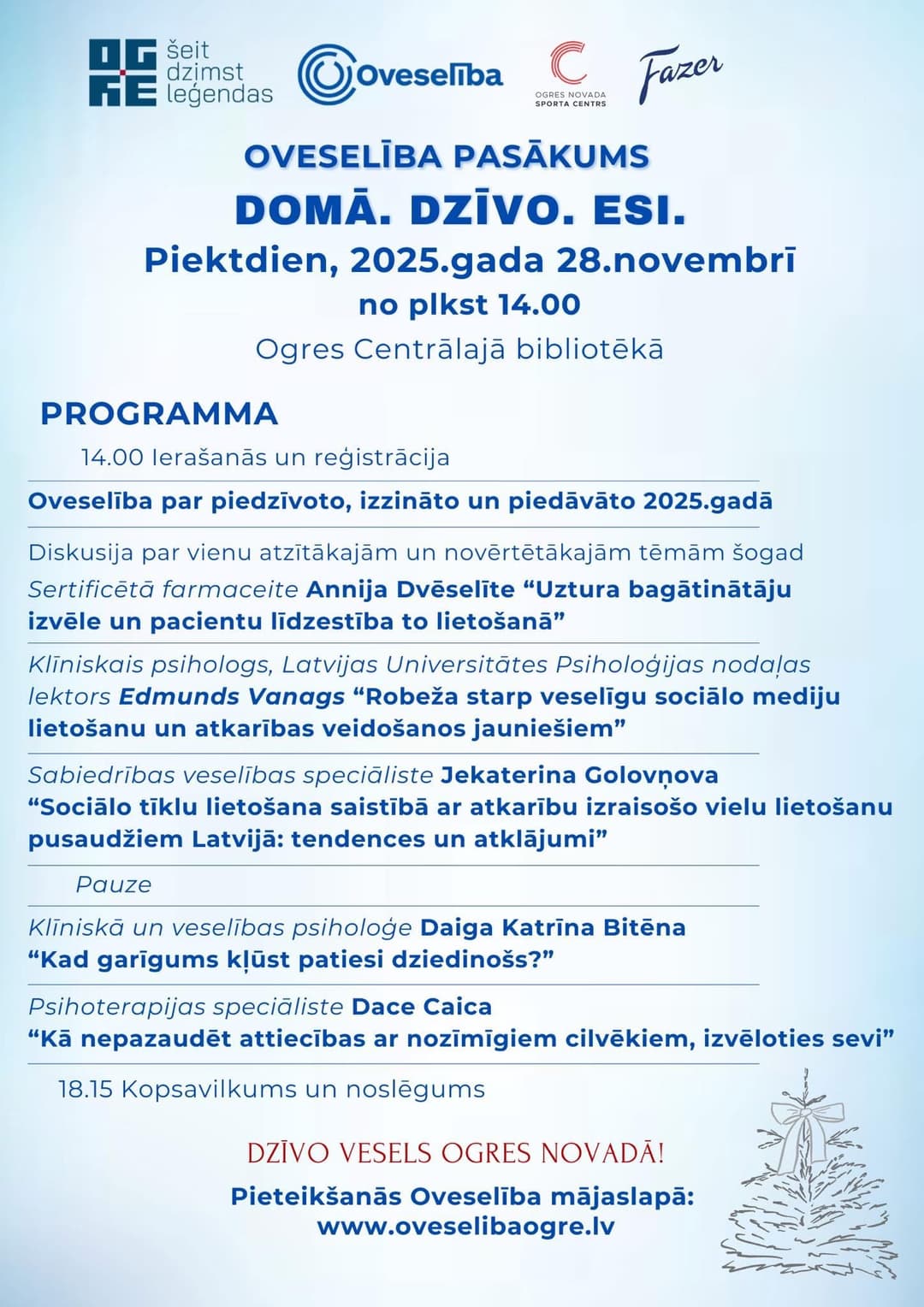 Atbildes uz šiem un citiem jautājumiem meklēsim Oveselība organizētajā pasākumā “DOMĀ. DZĪVO. ESI.”, kas notiks 2025. gada 28.novembrī no plkst. 14.00 Ogres Centrālajā bibliotēkā.