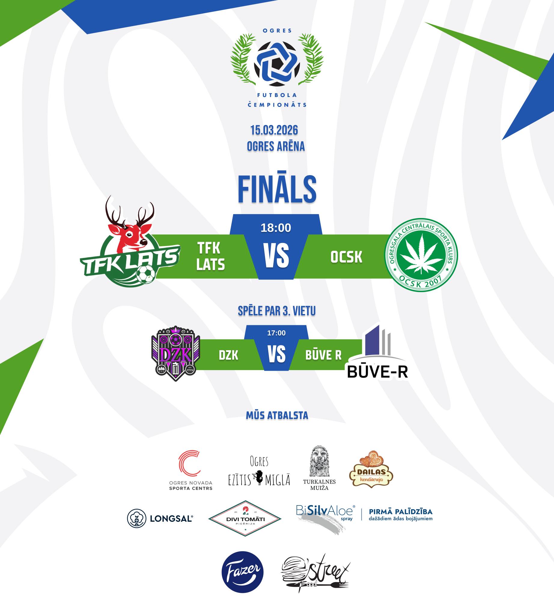 15. martā plkst. 18.00 Ogres Arēnā norisināsies Ogres futbola čempionāta finālspēle, kurā par čempionu titulu cīnīsies TFK Lats un OCSK komandas. Līdzjutējus sagaida aizraujoša spēle starp divām spēcīgām vienībām, kas sezonas gaitā pierādījušas savu meistarību un raksturu.