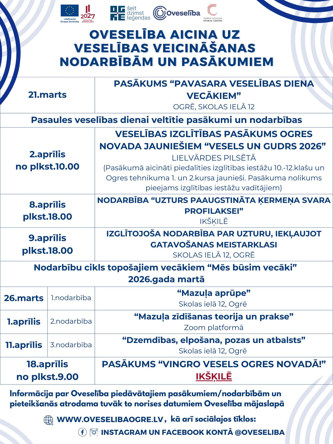Plašāka informācija par Oveselība piedāvātajiem pasākumiem un pieteikšanos būs pieejama tuvāk norises datumiem mājaslapā www.oveselibaogre.lv, kā arī sociālajos tīklos Facebook un Instagram kontā @oveseliba.