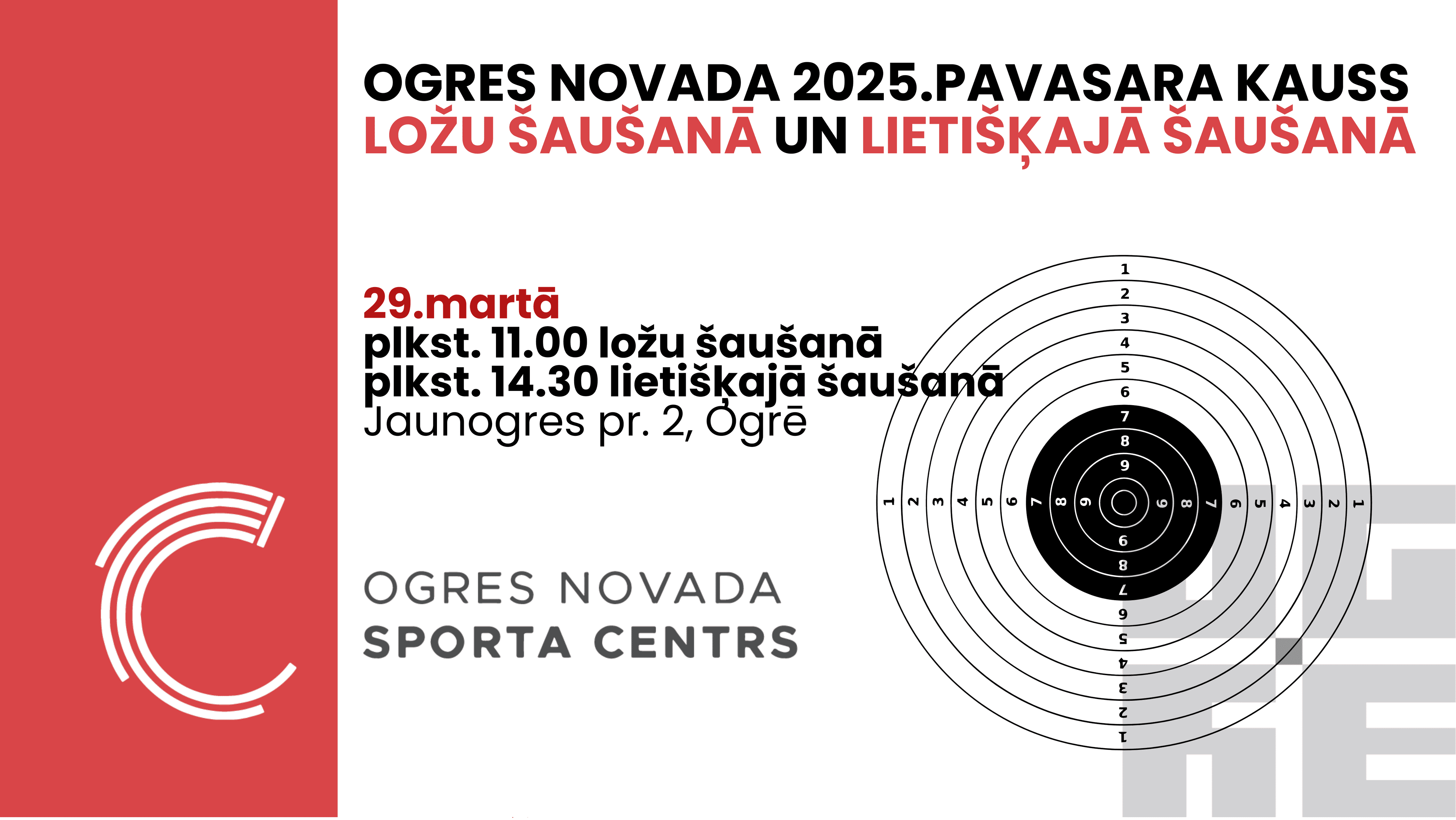 29.martā Ogres novada sporta centra šautuvē norisināsies Ogres novada Pavasara kauss 2025 ložu šaušanā un lietišķajā šaušanā.
